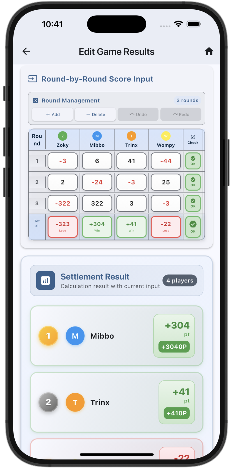 Points, table fees, and payouts are calculated instantly and shown in clear summaries for each game.