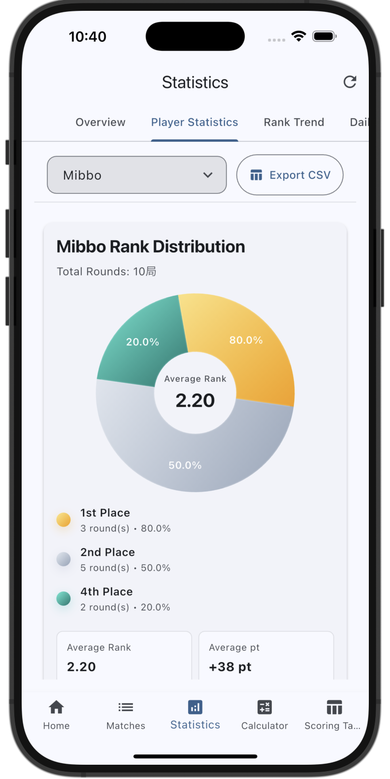 After each game, enter points and ranks. Rates and chips are stored too, saving time on settlements.