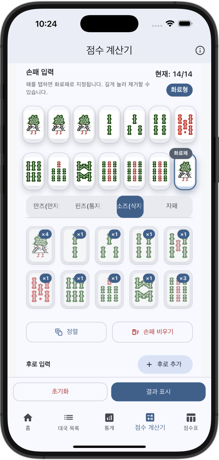 손패를 배치하면 부수·번수·점수를 자동 산출하고 부모·자식과 쯔모·론을 구분합니다.