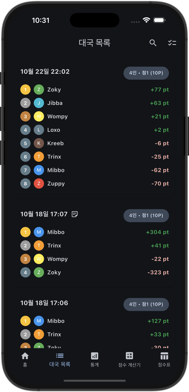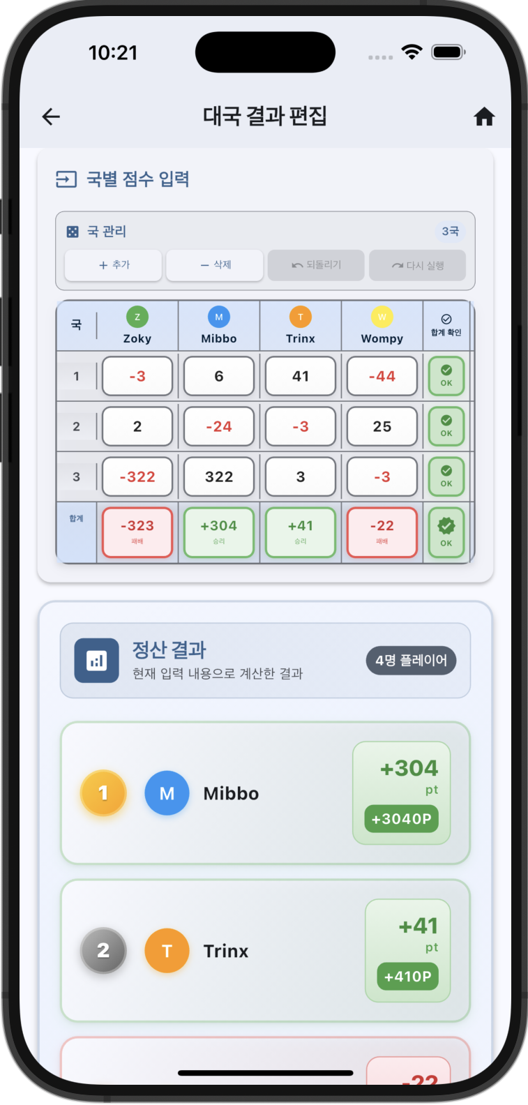 입력과 동시에 포인트와 장소료를 계산하여 대국별 상세와 정산 기록을 보기 쉽게 표시합니다.